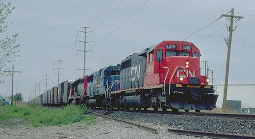 CN 5376 Northbound approaching the bridge over I-696 where a derailment in 1995 sent cars tumbling onto the expressway during the morning rush hour. Fortunately no one was injured. The rail in the foreground was installed the summer as the west end of the Mt. Clemens sub get's converted to welded rail. This photo was taken 5/26/96 at 11:45a. The rail was installed a few weeks later.