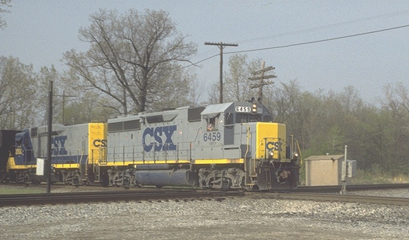 CSX 6459 leads a train of coal emptys Southbound across the NS Double track on May 17, 1996.