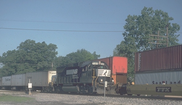 NS Symbol 228 Eastbound meets 254 Westbound at 8:00a 6-14-96. The Road Railer is a Hybrid Van/Rail Car used in a unique intermodal service. It is a key component in the "Just in Time" part's supply strategy now common in the auto industry manufacturing plants.