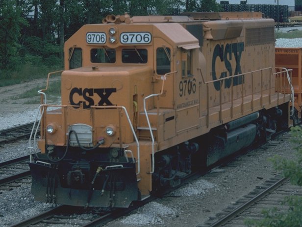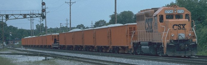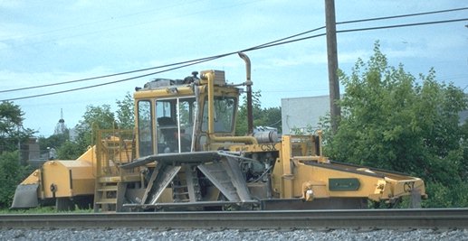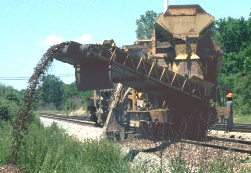 Much Ballast work took place in the summer of 1997 on the Plymouth sub west of the diamond. The operation begins with the undercutter which cleans the ballast by scooping, sifting out the dirt and replacing it. After the undercutter is through fresh material is added to replace the volume lost in the cleaning. This is spread and then tamped under the ties. This ballast train spent much of the summer at the Plymouth yard. The 9706 tied down most evenings just west of the diamond. Here the CSX9705 is working just west of MP CH25 at the grade crossing of Sheldon Road.