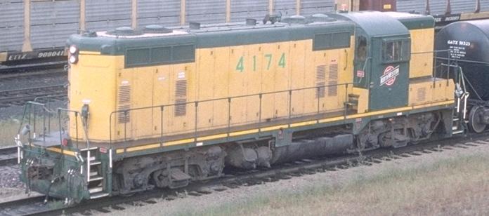 Working the Long lead out of the UP Yard Chicago and Northwestern 4174 in November 1996 still in the motherships colors.