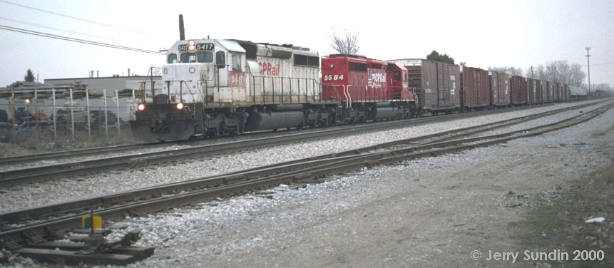 The usual consist for Soo trains is two or three SD-40s. This Westbound X501 shown here coming out at Eckles Road follows the pattern except for the paint. Photo taken at 7:30a 4-19-00