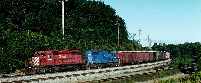 X514 Eastbound approach MP CH25 Sheldon Road. CP5574 leads Railink 203 past the Ford Heater Yard on 9-3-97 at 8:10a