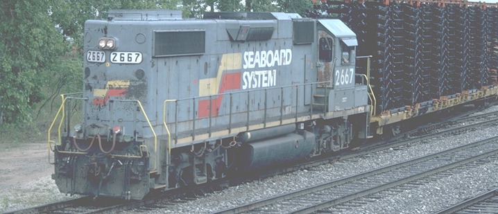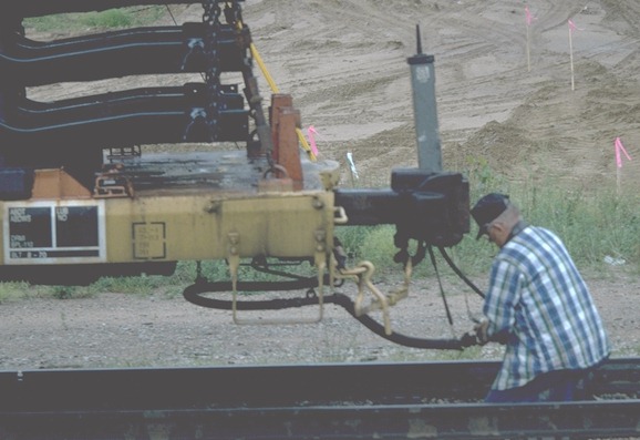D717 earns a slice of his daily bread switching A.O. Smith, an industry located on the NW Wye at the diamond. Yard engines rotate fairly often through Plymouth with the power shift usually occuring on Monday morning. The Utility man completes the job with the installation of the EOT marker. Today the next move is up the 10 track to wait his turn into Rougemere. Photos taken 8/21/97 5:30p.
