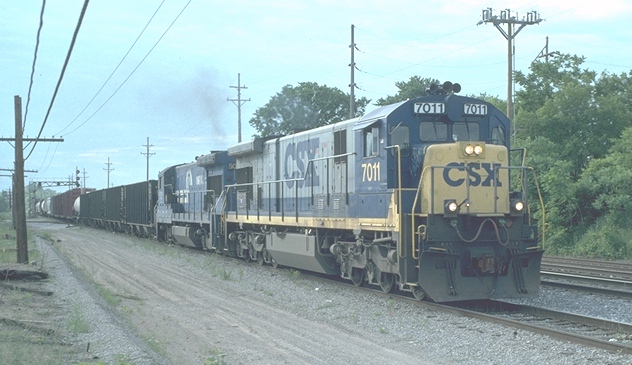 Q327 approachs Sheldon road at 7:53a 6/26/97. GE C30-7 Leads the Conrail in a consist leaving Plymouth east yard.