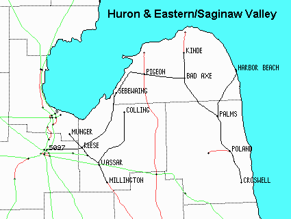 Former CSXT/Pere Marquette lines make up much of the mileage owned by one of the Rail America Inc. short line the Huron & Eastern/Saginaw Valley. Today a granger road with massive grain elevators about every twenty miles, it also serves Pioneer Sugar and Sebewaing industries. Connecting at Saginaw the CSXT retains trackage rights on much of the system.