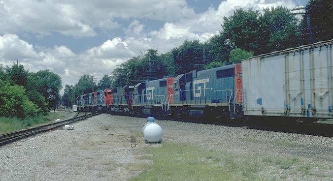 A GTW consist with an impressive lineup of GPs leads it train thru the CSX junction on 7/10/96. Viewed from the east the station is just visible between the trees.