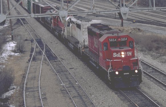 STL&H 5654 leads X504 through the East Yard on the main. The 2nd unit is CP671. The 4800ft train is headed to the CP tunnel office between Rougemere and Delray for a crew change at 16:45 2/21/97.