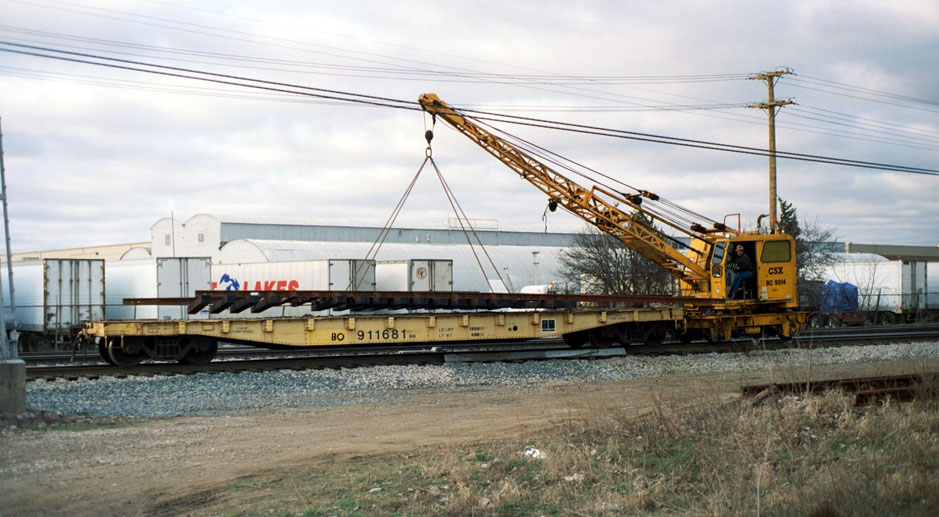 For small sections or to speed repair at a derailment site a prefabricated track panel is used. This crane is unloading a panel at Eckles Road, CH22.8. The welding truck showed up shortly after I ran out of film.