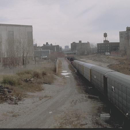 The Train Sheds of the vacant Michigan Central Depot are off to the right. Not visible is the Building. This train entered the MC (Conrail) track at Delray from the CSX Mainline which continues on to the Riverfront.