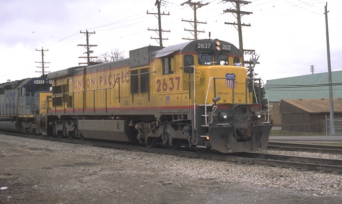 The afternoon traffic prevents me from making it to the sunny side of the train before the gates come down in time to catch the UP2637 at the head end of a soon to be westbound. Moments ago I was ready to chuck it, now the strange stuff at the head end has me ready to race west as he takes the crossover at Farmer.