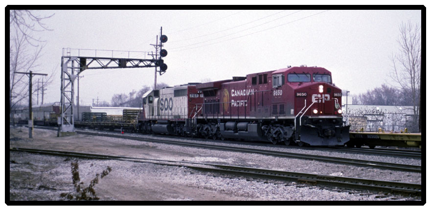X501 Led by the new and followed by the ancient. CP/Soo line is now commonly using a big GE in place of the string of EMDs. As they are shifting the lineups more SOO paint is also showing up in Plymouth. This shot was taken at 7:30a 3-29-2001 from an industrial parking lot northwest of the diamond. The lead in the foreground goes to a auto frame manufacturing operation that the Daily D717 starts from.