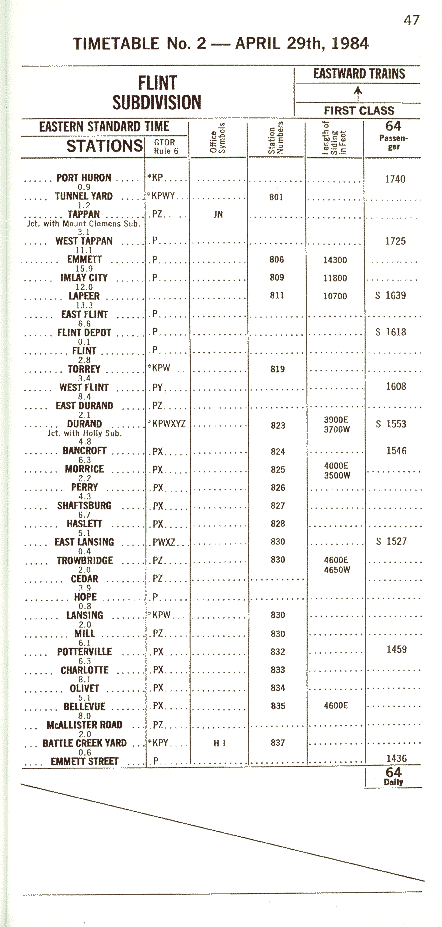 8.3 Mileage 261.5, Swartz Creek, 6,084 feet in length, switch points face E.&W. Cars or equipment must not be left standing within 300 feet West, or 350 feet East on Swartz Greek Siding at Raubinger Road, Mileage 262.0. Station Number 820.