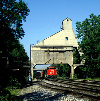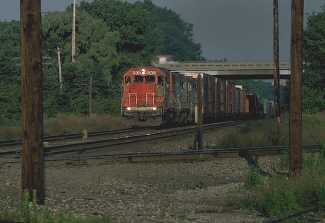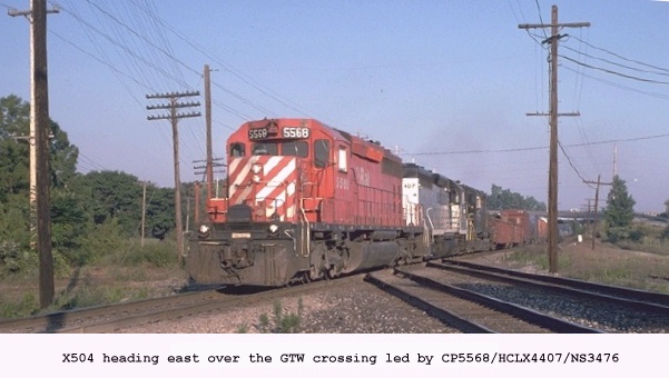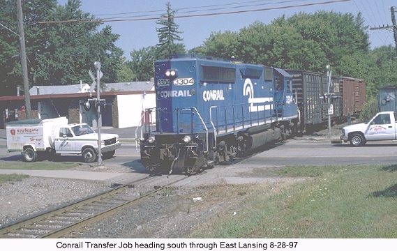A major rail junction at grade level, Trowbridge in East Lansing sees approximately 16m tons of lading annually. The GTW contributing 8m, CSX 4m and CP/Soo 4m. Auto plants and exchange traffic with Conrail are the major sources of originating traffic. A coaling tower which GTW hasn't used in 40 years provides a substantial refuge for the local pigeons (aka. feathered rats/flying carp). This structure stands about 1/2 mile West of the junction at MP 222.4. The low rent looking buildings south of the tracks are dormitories for MSU, they strongly resemble low income housing projects or a minimum security prison. On the CSX a Defect Detector at MP CH79.9 is within range and can help anticipate the arrival of westbounds. GTW has a detector west of the junction at MP 232.0 which helps with Eastbounds. GT apparently makes no grade crossings on the eastward approach as no airhorns are heard announcing their arrival. Westward movements hit a grade crossing fairly close by on either road.