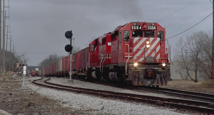 Westbound R203 (currently X503 Montreal-Schiller Park) waits in the hole at CH37.7 West End South Lyon on this eastbound. Photo is taken just west of the east end of the siding at South Lyon. Meets at this location are a daily occurrence.